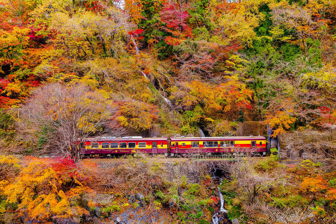 This retro trolley train runs along the lush Watarase Valley and links Kiryu in Gunma with Nikko in neighbouring Tochigi Prefecture. The 80-minute journey offers striking riverside views throughout the year although but the colourful foliage in autumn is particularly impressive. The leaves usually start changing colour at Ashio Station in Tochigi around the end of October, but you will see a range of colours on the ride due to the variation in altitude throughout the trip.