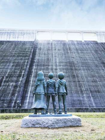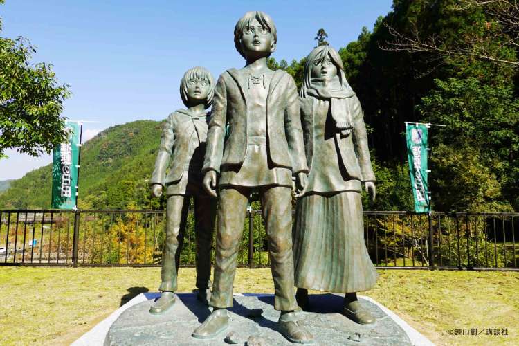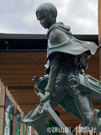 Bronze statues of the main character, Eren, and his childhood friends, Mikasa and Armin are featured at Oyama Dam in Hita. You can also find a bronze statue of another beloved character, Levi Ackerman, placed in front of JR Hita Station. Both statues have become famous sightseeing spots.