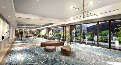 The exclusive foyer is designed with nature motifs in various places, such as blue-grey-tone carpets inspired by the ripples of the water surface and wood doors, making it a space where guests can enjoy a relaxed atmosphere for arrival reception and refreshments. Movable ottoman-style chairs and velour sofa are positioned throughout the foyer, including a non-contact wireless USB-type charging port for an additional service for guests utilise.