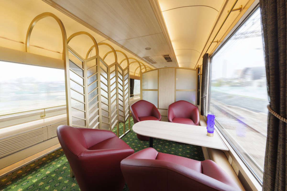 The interior of "Aoniyoshi" is designed with two rows of seats, so passengers can relax comfortably and soak in the history and culture of the ancient city of Nara from the moment they board the train.