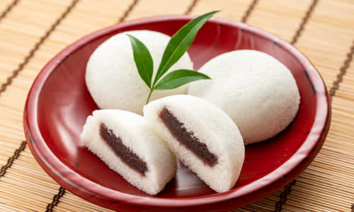 Karukan is a traditional Japanese sweet from Kagoshima Prefecture, featuring a blend of rice flour, sugar, and grated Japanese mountain yam (yamaimo). This unique ingredient not only adds a subtle sweetness but also contributes to the cake's soft, moist texture. There are two types of appearance: a long rectangular shape and a round shape. The long rectangular shape is a plain Karukan without any filling inside, while the round shape is known as "Karukan Manju" and contains sweetened red bean inside.