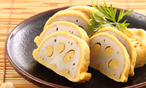 Karashi Renkon, a beloved dish in Kumamoto, combines lotus root and Japanese mustard. The lotus root is typically sliced and stuffed with an aromatic mixture of Japanese mustard and miso paste, creating a unique blend of flavours and textures. It's then lightly coated in a batter and deep-fried, offering a crispy exterior that contrasts beautifully with the tender, flavourful filling.
