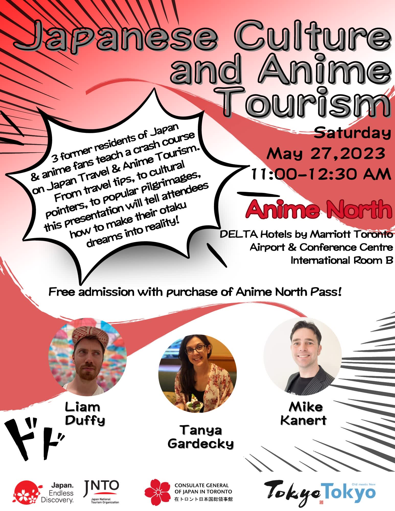 Next Saturday (May 27th), JNTO will be joining Tokyo Tourism and the Consulate General of Japan in Toronto to provide an information session on Japanese Culture & Anime Tourism as part of Anime North. The presentation will feature three segments – one providing basic travel information about Japan, two introducing points of interest for anime fans both nationwide and in Tokyo, including places that inspired the settings for several popular anime! The panel will be held from 11:00AM-12:30PM in the Delta Hotels International Room B.
