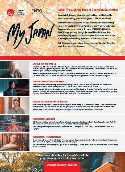 Our brand-new campaign, My Japan - Japan thru the Eyes of Canadian Celebrities, is launching in November 2020 and will run through to February 2021. Five videos of Canadian celebrities will be aired in rotation on the movie channels of the Air Canada Entertainment System, embedded in a full-page Ad in 2 issues of enRoute magazine, and posted on several online sites. Check out the eclectic range of experiences that this diverse group of celebrities discovered during their eye-opening travels through Japan.