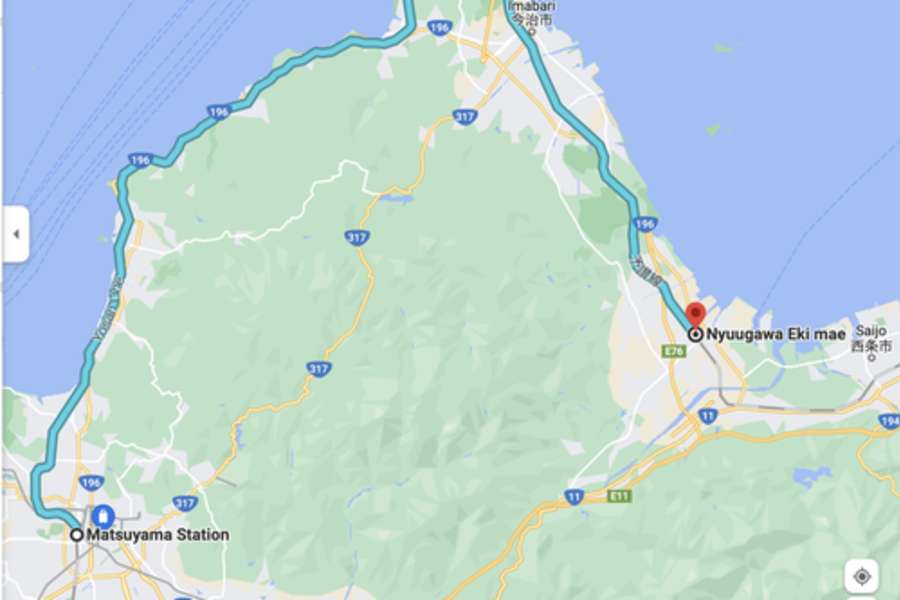 The ferry is not located in the city of Matsuyama but in a town called Saijo 「西条」. The closest station is Nyuugawa Station 「壬生川駅」 and it takes approximately 1 hour by a limited express train from the JR Matsuyama station and costs 1200 yen.