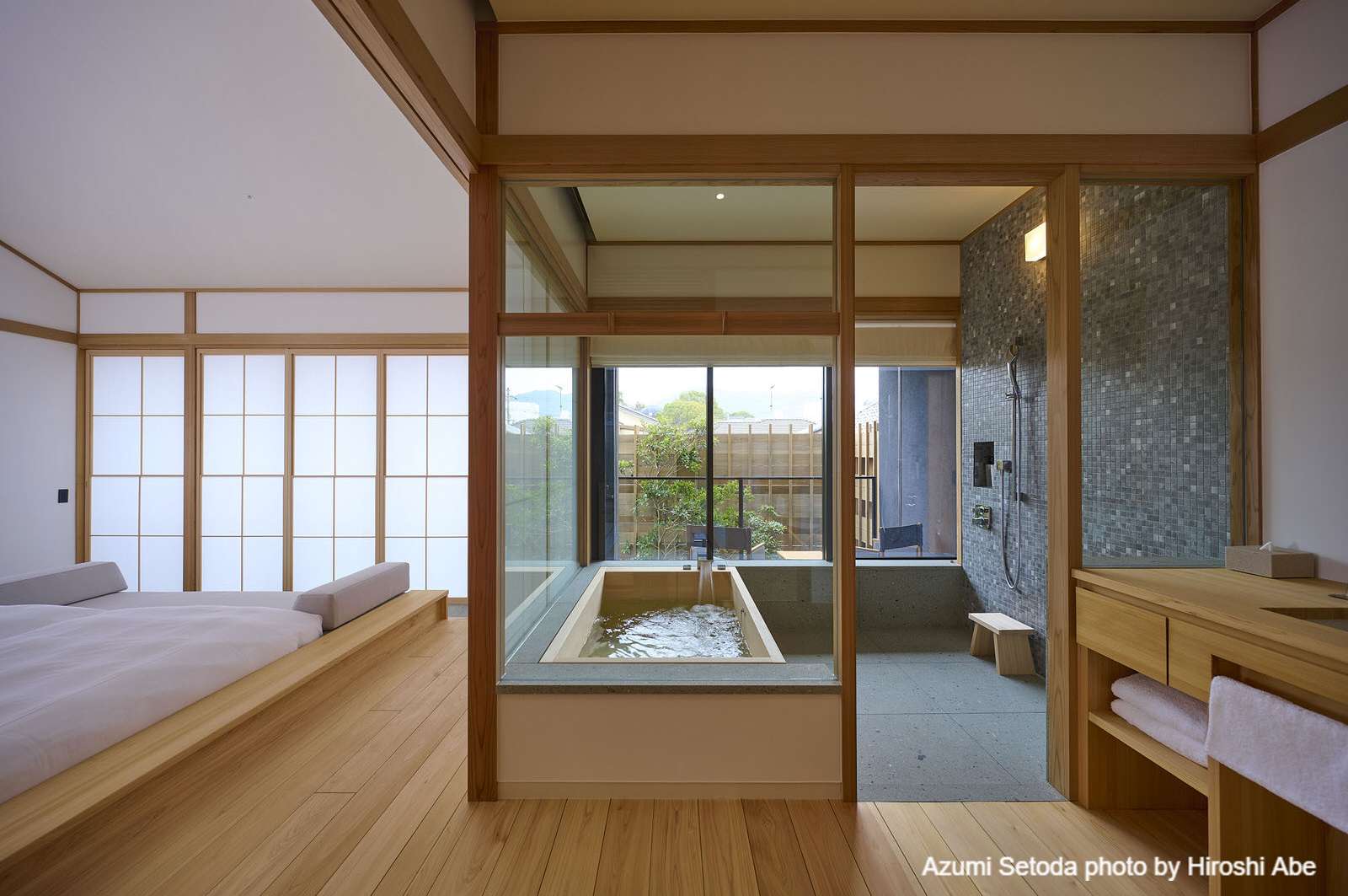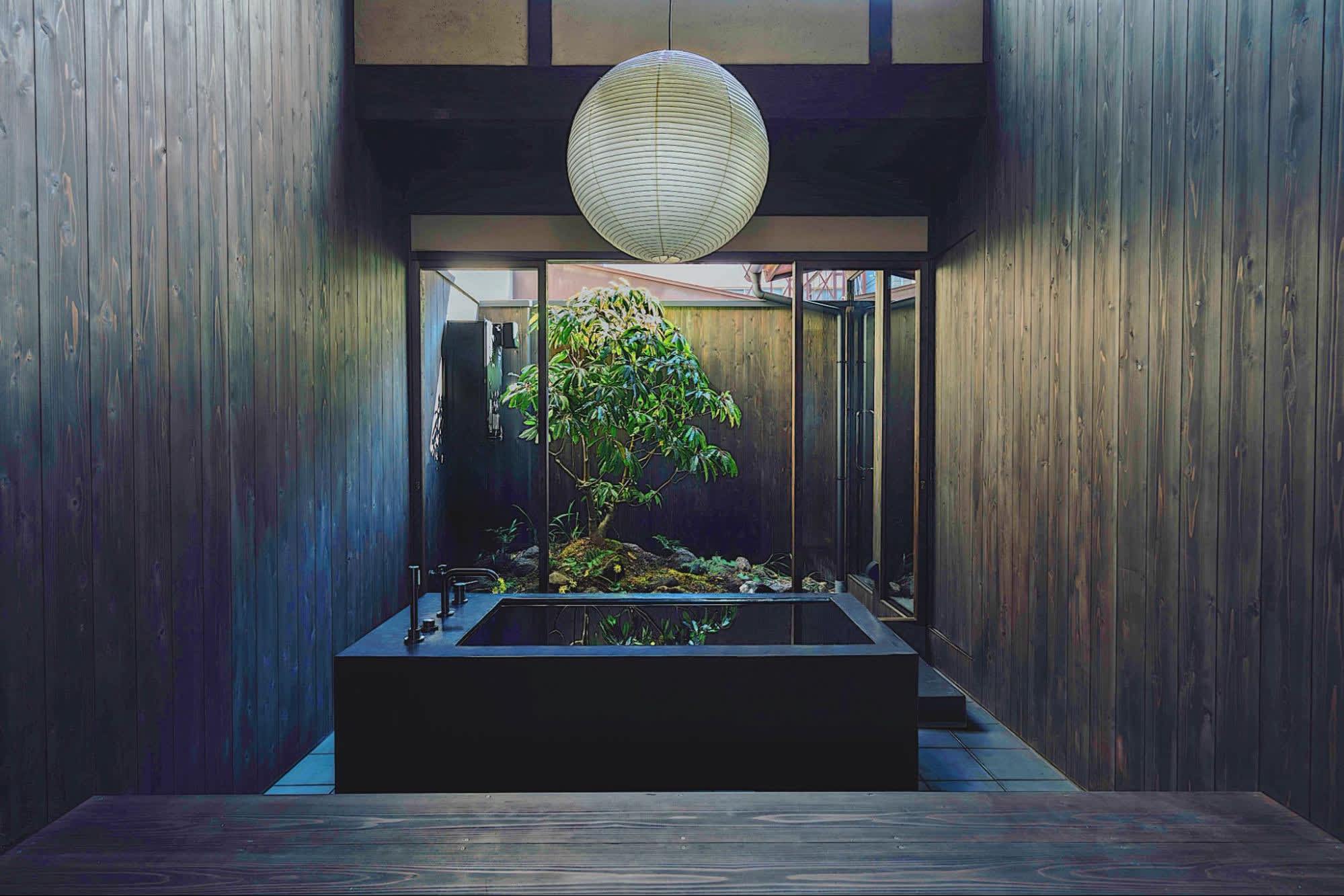 Ob sie stimmt, weiß ich nicht, aber die Geschichte geht so: Als die Jugendfreundinnen Hana Tsukamoto und Irene Chang ihren Geschäftsplan, die Lücke zwischen AirBnB und der Luxushotellerie zu schließen, auf eine Restaurantserviette in Spanien kritzelten, hätten sie sich nicht träumen lassen, dass sie ihn drei Jahre später in die Tat umsetzen würden. Die beiden jungen Designerinnen haben in den letzten Jahren die Maana Homes geschaffen, eine Kollektion von Machiya-Stadthäusern in der alten Kaiserstadt Kyoto, die einen modernen Look und handwerkliche Tradition mit einer wohnlichen Atmosphäre verbinden. Es wurden Vinylverkleidungen und Kacheln entfernt, um Lehmwände und Balken freizulegen. Minimalistische Wohnbereiche öffnen sich und geben den Blick frei auf den Hingucker: ein großes Steinbad unter einer mondähnlichen Papierlaterne.
