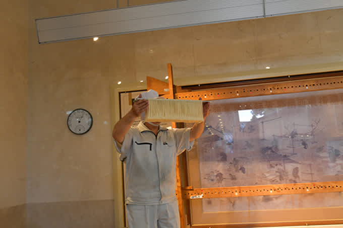 The finished noodles, deftly handled with chopsticks, are 160 centimeters long. Care to give it a try? Visitors get a chance to handle the somen with chopsticks after each demonstration. It’s harder than you think! The noodles are incredibly elastic in texture and require a firm hand—but not so firm that the noodles snap.