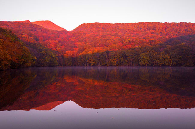 www.japan.travel/en/spot/1875/Lake Tsutanuma in the Aomori Prefecture is home to a vibrant "vermillion vista", which makes it look like the sides of the mountain surrounding it are on fire. The ancient beech forests around it appear drenched in yellow paint until the morning sun hits them & creates a rich reddish hue. This special sight can only be seen in the early mornings in the second half of October.