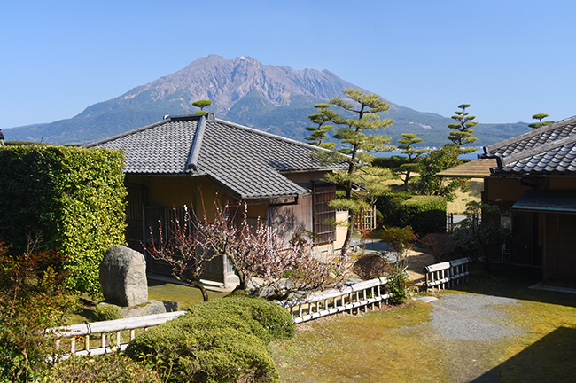 Aso Kenkonomori LocationA garden built in 1658. The magnificent scale of its “shakkei” (use of surrounding naturalscenery, is beautiful and using the view of grand Sakurajima and Kinko Bay to resemble an artificial hill and pond. It is designated as one of the scenic beauties of Japan.
