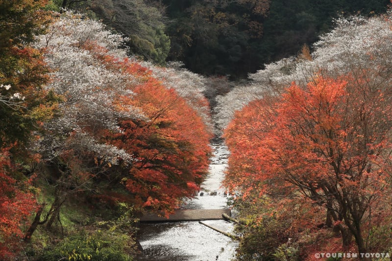 While most cherry blossoms bloom in the spring, there are a few places in Japan where you can see both fiery red and orange autumn leaves and soft pink cherry blossoms at the same time. In the mountainous Obara area of Toyota City, you can see shikizakura, a type of cherry tree that blooms twice a year, in spring and autumn.