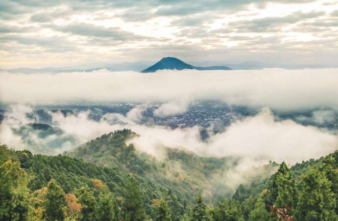 On winter mornings in Ozu City on the island of Shikoku, the sun rising over an undulating sea of clouds pierced by mountaintops is a memorable sight. Before dawn, locals equipped with cameras and thermos flasks filled with hot drinks head towards the mountains to admire this not infrequent meteorological spectacle. There are several sightseeing spots, but the slopes of Mount Takayama are easily accessible from the city center; cyclists can get there in less than 20 minutes. The narrow valleys of the Hiji River basin trap these low-lying clouds for several hours, until the ground temperature rises and the sky regains its perennial blue.