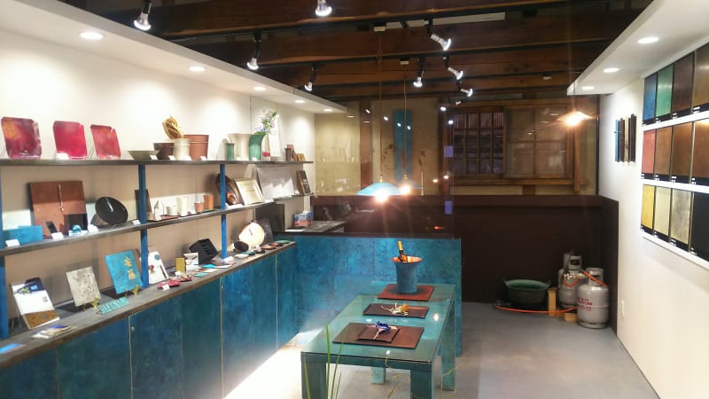 Orii Gallery Hachinokura is located in the Yamacho Valley, an area of Takaoka City known for its traditional storehouses. The gallery is decorated throughout with blue copper plating, which lends it a refreshing, airy atmosphere. Here you can find a wide range of metal craft products, from original items to building materials and nameplates.