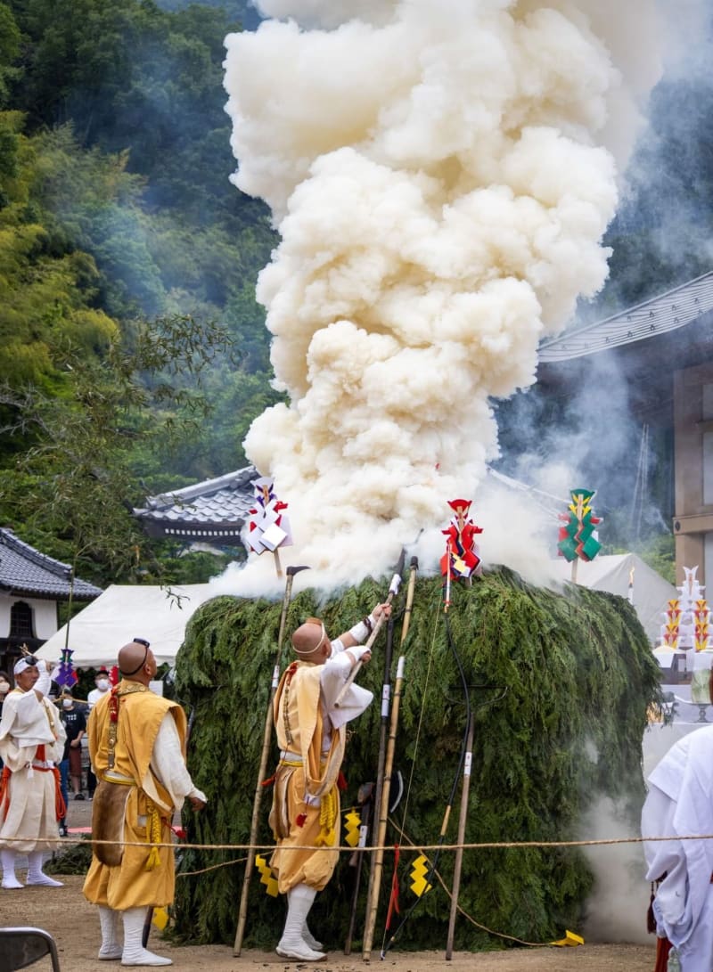 The Buddhist fire rituals that take place during the Fire Festival, held at Mitsugonji on the third Sunday of May each year, are a fascinating sight. During the main ritual, a huge wooden frame is draped in cedar branches and set aflame, creating massive plumes of smoke as the flames devour the leaves and blacken the wood. As the smoke subsides, monks chant and toss wooden planks containing the attendees’ written prayers and wishes into the flames. The fire is believed to purify negative energy and help prayers come to fruition.