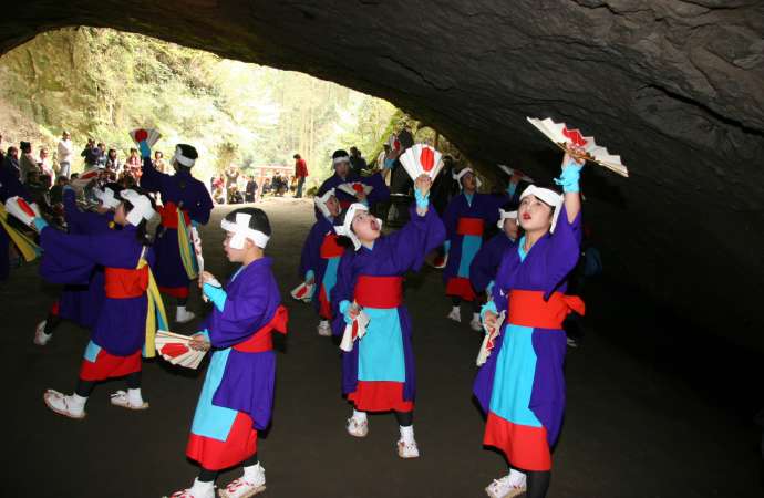 On the Sunday closest to Buddha’s birthday on April 8 every year, a festival is held with a sword or stick dance (the dance style alternates each year) dedicated to the Rock Kannon Goddess of Mercy enshrined at the entrance to the cave. The dances are said to have been started by the Shimazu clan as a celebration of their first victory. Children from Nakatani Elementary School in nearby Takarabe perform the dances that have been passed down through generations as part of their local heritage education.