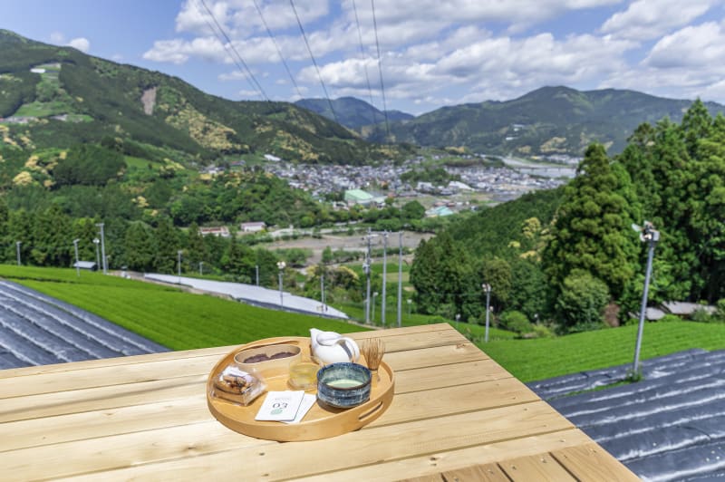 The Tamura family has cultivated tea along the mountainsides for thirteen generations. When the current owner was a child, he would sometimes help out in the fields and enjoy the bliss of taking a break and looking at the views from the slopes. Making a terrace in the tea fields was one of his dreams, which he made a reality by constructing an open-air tea terrace using local cypress from the Oigawa River basin. A local tatami shop made the mats, and now visitors can enjoy sipping tea from this one-of-a-kind tatami terrace.
