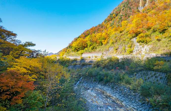 The best time to see this impressive waterfall and its powerful spray is in spring and summer, when the water flow is at its peak. In spring, when the snowmelt from the Tateyama Mountain Range is abundant, the Hannoki Falls form to the right of the Shomyo Falls. Sometimes the rare sight of a V-shaped waterfall can be seen. This is the only place where you can see such striking, rare scenery, with three parallel waterfalls combined with the roar of water crashing down.
