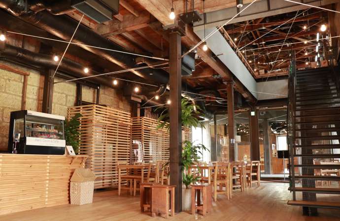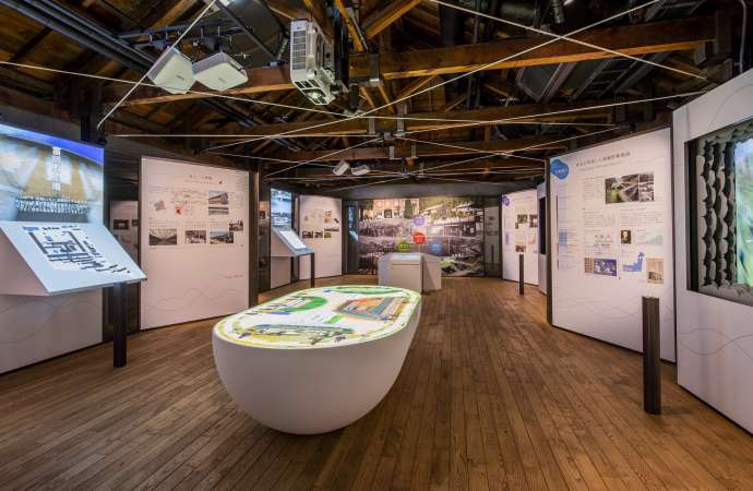 The white wires running beneath the ceiling of each building, inspired by the silk threads once produced in Tomioka, are used to seismically reinforce the structure. The three warehouses were each constructed using a different material – wood, stone, or brick – and each has a distinct atmosphere that transports you back in time.