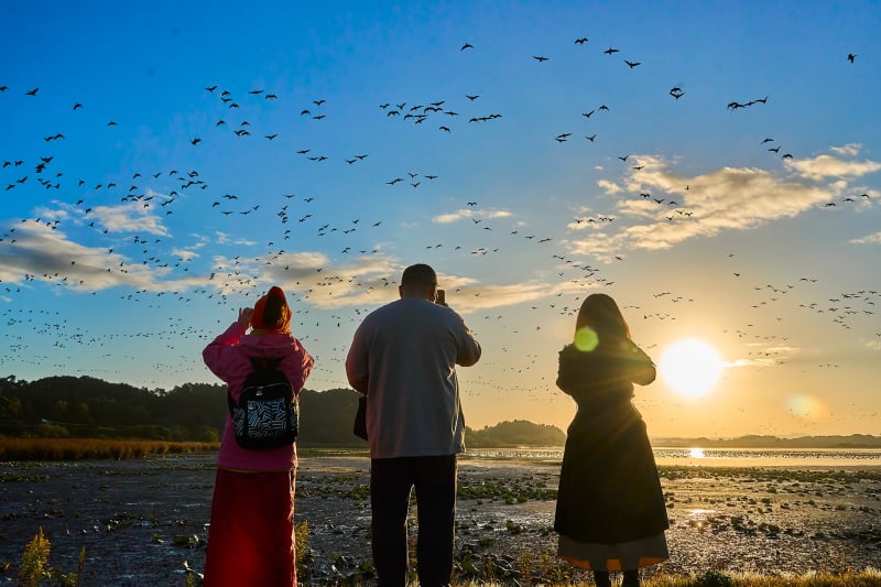 The relatively narrow wetland area between the rice paddy fields and the water's edge allows visitors to see the feathered beauties at close range. The experience of being surrounded by a flock of birds rushing toward you from the surface of the lake is unforgettable.