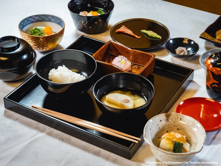When the powerful Maeda clan governed the Kaga region (part of modern-day Ishikawa Prefecture) from the 16th to 19th centuries, refined Japanese culture flourished under their patronage. It can be said that the Samurai class was especially conducive to the continuation of sado in this region. The sado is still carried on in Kanazawa as an exquisite, singular moment in time shared by its participants. A traditional tea ceremony is often preceded by a simple, healthy meal, known as cha-kaiseki, which typically consists of a soup and three small dishes made with seasonal ingredients. The seasoning is subtle in order to emphasize the flavors of the individual ingredients and prepare the palate for the tea. Enjoy cha-kaiseki cuisine supervised by tea master Sokyu Nara at renowned ryotei restaurant Kinjoro. The restaurant stands on the grounds of a former residence of the Maeda family, and was established in 1890 with much of the original garden preserved.