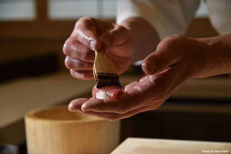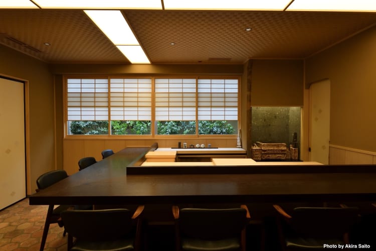 Proceed through the hidden entrance (keep your eyes open for the lantern on the street) and continue along the dimly lit passageway to enter into a simple and elegant dining room. Behind the counter stands Toshikatsu Aoki, preparing your meal. Chef Aoki took over from his father, Yoshi Aoki, after completing his apprenticeship. Aoki wants this to be the purest distillation of the craft of sushi: you, the chefs, the fish.