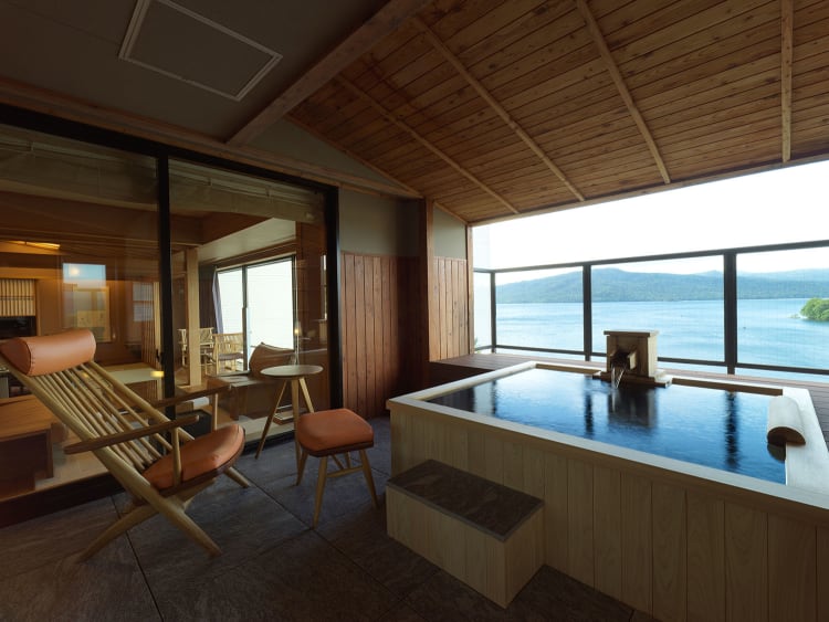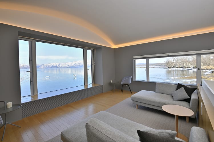 Tsuruga Resorts offers several kinds of accommodation in the Lake Akan hot-spring town; standout among them is the boutique-style Akan Tsuruga Bessou HINANOZA Each of its 25 suites boasts an outdoor bath, and most offer full-on views of the lake. In-room spa service brings the luxury of facials and full-body treatments right to your door. Unwind in the stylish bar or listening room with wine or a house-made liqueur, and don’t miss Tsuruga’s gallery of works by local artists.