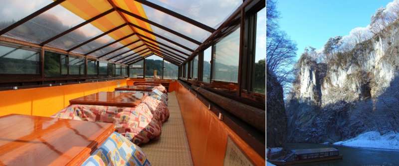 On the fifth and final day in the Tohoku region, we went to Geibikei in Ichinoseki. Along the Satetsu River, there’s a limestone cliff that stands at a height of more than 50 meters and stretches for about 2 kilometers. Since it was winter, we took a kotatsu boat to catch the view. A kotatsu is a heating apparatus in which the upper part of the heat source is covered by a parapet (protective wall) and a futon is draped over it. It was my first experience with Japanese kotatsu, and it was warm and cozy.