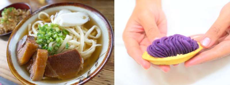 If all the excitement of the Naha Hari Festival makes you hungry, grab a bowl of noodle soup (left) or nibble on a biscuit with purple sweet potato (right).