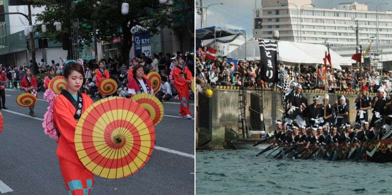 Popular Kyushu festivals include Hakata Dontaku (left) and Naha Hari (right) | Photo credit: Naha City Tourism Association