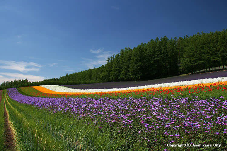 Shikisai-no-oka is a 7 hectare flower garden hill, about 300 meters long, carpeted with flowers in Biei. From April to October, you can enjoy the colors and fragrance of tulips, lupine, lavender, salvia, sunflowers, dahlia and Japanese anemone.