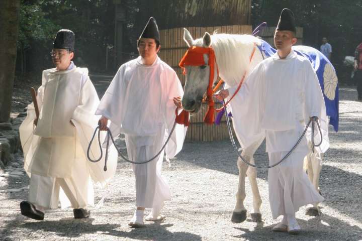 There are as many as 1,500 rituals at Ise Grand Shrine in a single year, like the main one which is the “Tsukinaminomatsuri Festival”, when offerings are purified twice a day for all gods. On every 1st, 11th, and 21st of each month, “Shinmekenzan” is held at eight in the morning, which is a service involving a shinme (a horse dressed sacredly). Visitors can line up along the approach of the outer shrine or the inner shrine and watch.