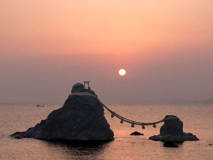Futamiokitama Jinja is said to be the spot at where believers of Ise Grand Shrine first purify their mind since the past. This is called “Hamasangu”. Here, you see visitors pouring water over some frog statues called “Gankake frog” to pray, and the Meoto Iwa which is the symbol of the Futamigaura area. You certainly need to catch both. The meoto iwa (literally “couple rock”) consists of a 9m high male rock and 4m high female rock. They look as if they are leaning towards each other, and are connected by an Oshimenawa sacred rope to bring fortune and love.