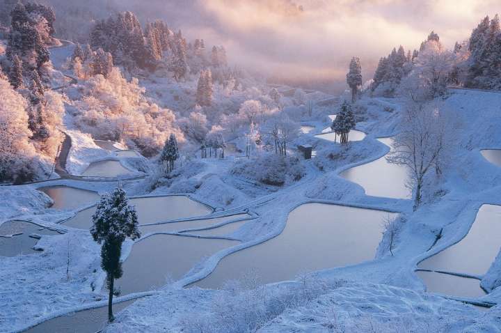 “Hoshitoge Rice Terraces” in the city of Tokamachishi is recognized as one of the “Top 100 Villages in Japan” where you can find over 200 farm fields in different sizes on the sloped plane shining like scales of fishes! From late October to November, the rice fields filled with water reflect the azure sky like water mirror, so this spot is absolutely a must-go for photo lovers. Magical sea of clouds may also be seen early in the morning. You also do not want to miss the snowy views in winter!