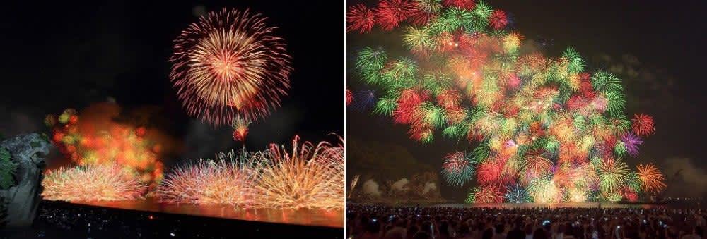 Kumano Fireworks Festival is a traditional display which has been held for the last 300 years. This giant fireworks show takes place in Kumano, a seaside town in southern Mie Prefecture. The performance features 10,000 fireworks detonated from boats and rocks in front of the natural grandstand of Shichiri Mihama Beach and the World Heritage Site of Onigajo. Here, you can witness the famous "kaijo jibaku” (fireworks on the sea) set off from boats which create a spectacular semicircle of reds, blues, and yellows in the sky, beautifully reflected in the water.