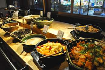 Miyakoyasai Kamo is a chain of 3 tabehoudai restaurants serving breakfast, lunch, and dinner, featuring various seasonal organic produce, including kamonasu (a Kyoto version of eggplant), pumpkin, radish, and more, sourced from nearby farms. The restaurant operates a buffet counter where you can help yourself to refills. Miso soup is served with each meal in addition to dessert.