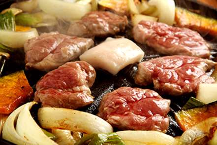 The meat is served either marinated or unseasoned – this lets you enjoy the true flavour of the meat – which you dip in sauce after cooking. The meat is always cooked atop the vegetables so that they absorb the flavour. When cooking unseasoned meat, melt lard on the grill to ensure the food doesn’t burn.