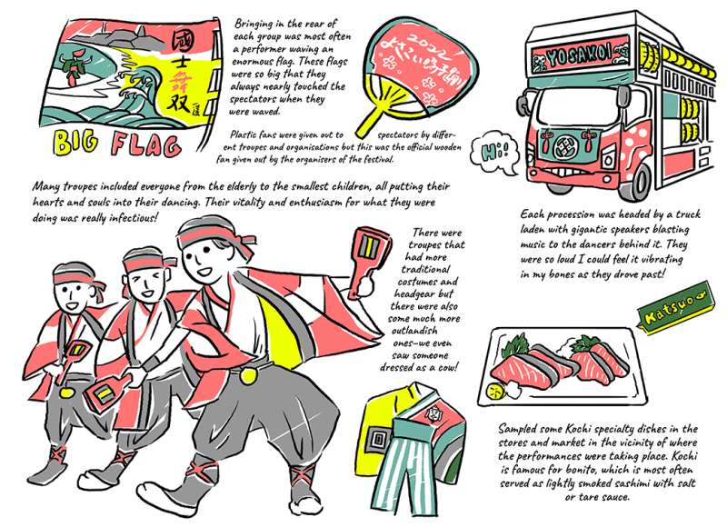 In addition to local organizations and students, yosakoi performing groups from across the country participate. Each team showcases their distinctive styles with their own music and choreography, both ranging from traditional to more unconventional genres like funk. The fancy, colorful costumes unique to each team and ornately decorated music trucks brighten up the parade, making it an incredible mix of colors, sounds, and eye-catching visuals. Although its free-for-all style may not work in other cities, Kochi City fully embraces the wonderful visual form that the festival brings to summer.