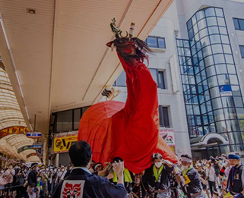 The Uwajima Ushi-oni Festival is held annually from July 22 to 24 in Uwajima City, Ehime Prefecture. The festival is known for its floats resembling the ushi-oni, or cow demon. Each float is measured around five to six meters long with a face of a demon, a long neck, and a body made of bamboo covered in cloth or plant bark. One of the largest Ushi-oni floats requires almost fifty strong adults to carry it, whereas children carry the smaller, lighter Ushi-oni floats.