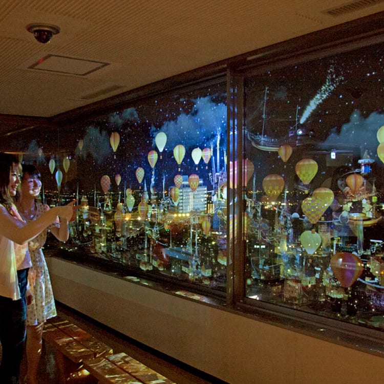 This New night attraction at Saga Prefectural Office is the talk of the town! At the Observation Hall on the highest floor of the office, which is the highest spot in Saga Prefecture, such projection mapping videos as the sight of the city changing with the times, restored Saga Castle Tower, night flight of hot-air balloons, and other historical and cultural events are shown on the window as wide and high as 30 m and 1.7 m with the night view of Saga in the background. Of those videos, the images of fireworks being launched and numerous hot-air balloons in the sky are so accurate that one confuses them with a real night view. The light and images from the projection mapping also reflect on the wall, ceiling, and floor, creating a fantastical atmosphere where a couple can definitely enjoy a romantic night.
