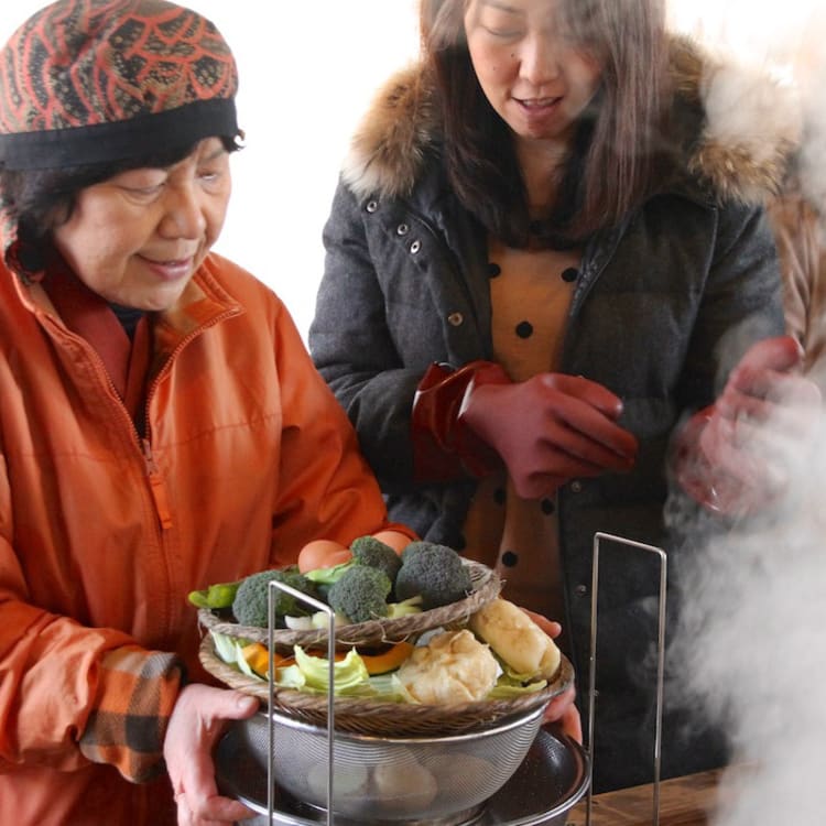 Known as “Onsen Paradise”, Beppu in Oita Prefecture has a special dish called “jigoku mushi”, which means “steamed dishes from Hell’s kitchen”. Ingredients are cooked in a very traditional way in a cooker called “jigoku-gama” (Hell’s cooker) on a fumarole from which hot-spring vapor with a temperature of 98 degrees Celsius gushes out to steam them.