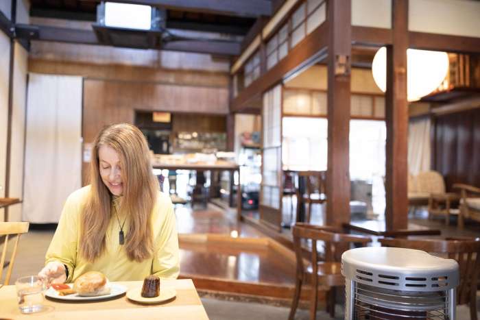 I’m feeling hungry after being out in the crisp mountain air. There are dining options along the ropeway, but I head down to have lunch in the charming castle town of Furukawa, where white-walled storehouses line the central streets. FabCafe Hida is a creative hub inside a renovated kominka farmhouse that once served as both a sake brewery and a woodworking studio. The café dishes up hearty fare made with local produce, and I choose a delicious bagel sandwich and soup set.