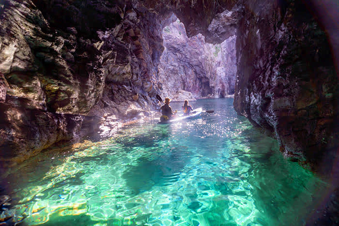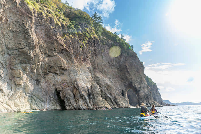 Hoping to view the dramatic coastline from a unique vantage point, we set off in sea kayaks. Joining us were two guides who had moved from the city, captivated by the natural splendor of Oki. The water sparkled in shades of emerald and cobalt, offering glimpses of small fish and tangles of seaweed below. As we paddled, our guide pointed out unique rock formations, including one that looked like an elephant’s trunk. “The cliffs are made of alkali rhyolite, quite rare in Japan,” he explained.