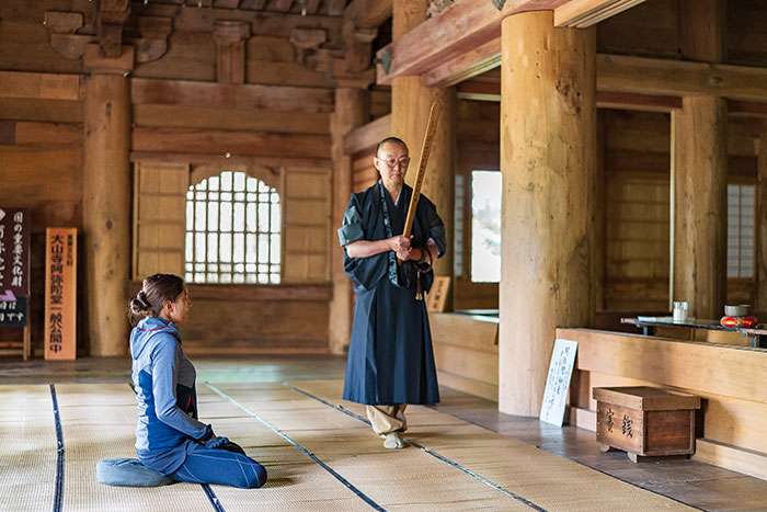 Beyond the main hall of Sanbutsuji Temple, which sits at the base of the mountain, stands a towering cedar tree, flanked by a crystal-clear stream. “This marks the threshold between the ordinary and the divine,” the priest noted. After having our footwear checked for safety, we set off on the steep ascent, navigating narrow ridges, chain-secured boulders, and tangled tree roots. The thrilling climb brought us to Monjudo Hall, where panoramic views unfolded from its wooden terrace, rewarding our efforts.