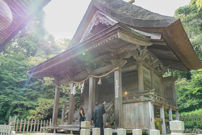 The Oki Islands are home to more than 100 shrines and temples. Our last stop was the Tamawakasu-mikoto Shrine, the main shrine of the Oki Islands. Its striking thatched roof reflects the traditional Oki-zukuri style, and the shrine is famed for the Goree-Furyu Festival, where horses race through the grounds. One of the most revered sights is an ancient cedar, over 2,000 years old. Guided by the chief priest, whose family has served here for 48 generations, we explored the grounds and took a moment to pay our respects.