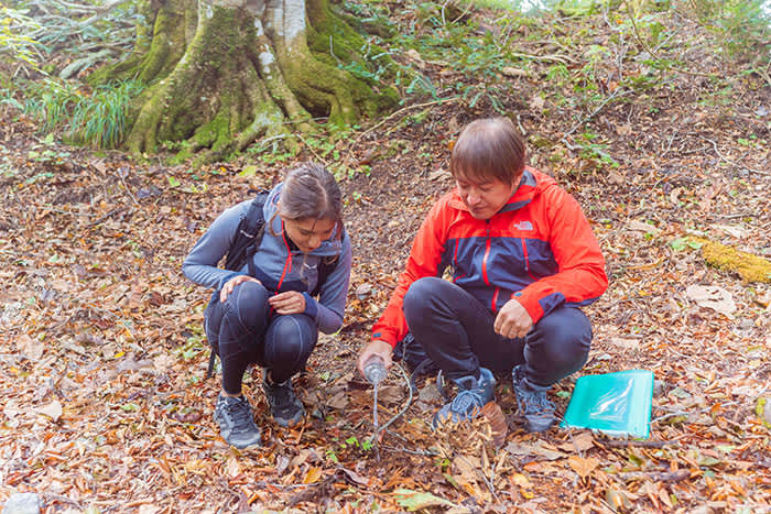 Daisen is home to the largest population of beech in western Japan, and we learn that this has deep, symbiotic ties to the region’s mineral rich waters. To demonstrate, he poured a bottle of water into a thick layer of humus that had accumulated under an old beech. “This will reappear 20 years later in the form of spring water, after absorbing nutrients from beech leaves on the forest floor and the bedrock underneath.”
