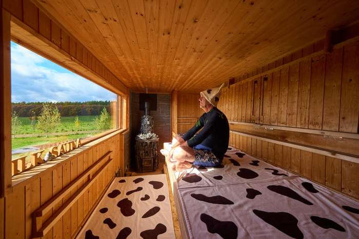 I try the sauna myself—wood-fired—and perched on cow-pattered towels, enjoy a relaxing steam as I look out over what seems to be the biggest sky in Japan. I was already feeling pretty relaxed after sampling some of Shinmura’s clotted cream and milk syrup and our stroll across the property. Now I just let my imagination take me out across the vast landscape, past the grazing cows and the rolling fields, the mountains standing in a long row to my left. I feel a real closeness with the natural world.