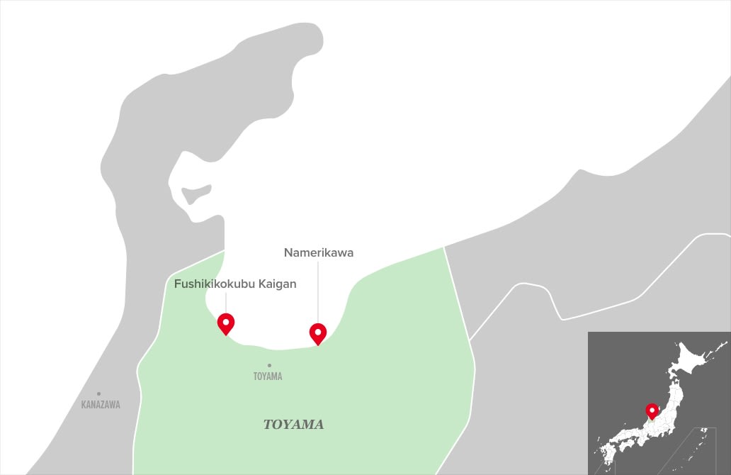 Enjoy the unique geography of Namerikawa with the height of 3000m Tateyama Mountain Range to the depth of 1400m Toyama bay