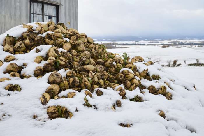 Sugar beets in a snow-covered field in Biei
