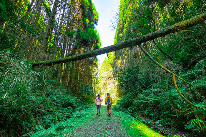 Beyond Nabegataki Falls, Oguni Town offers distinctive attractions, including the Former JNR Miyanoharu Line Walking Experience. The route features tranquil landscapes, where cedar trees tower overhead and lush greenery carpets the path, creating an ethereal, almost otherworldly atmosphere.