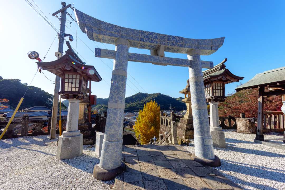 You can visit Sueyama Shrine for a unique porcelain shrine experience. Walking up to the shrine, the first thing that you encounter is a large porcelain torii gate. While toriis are traditionally red, this one is blue and white, beautifully decorated and designed in the way of Arita ware. When you finish your shrine visit, you can pick up even more unique shrine goods, as they are also made of porcelain!