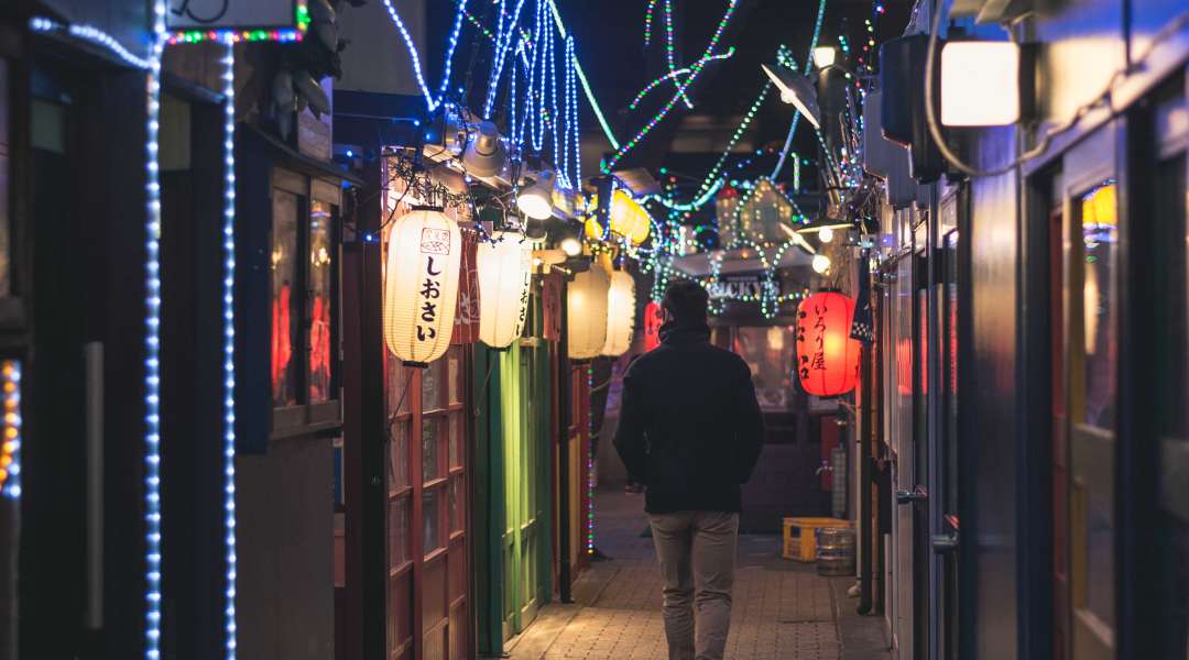 A man walks down Miroku Allet in Hachinohe's Yatai Mura street food village © Aomori prefecture
